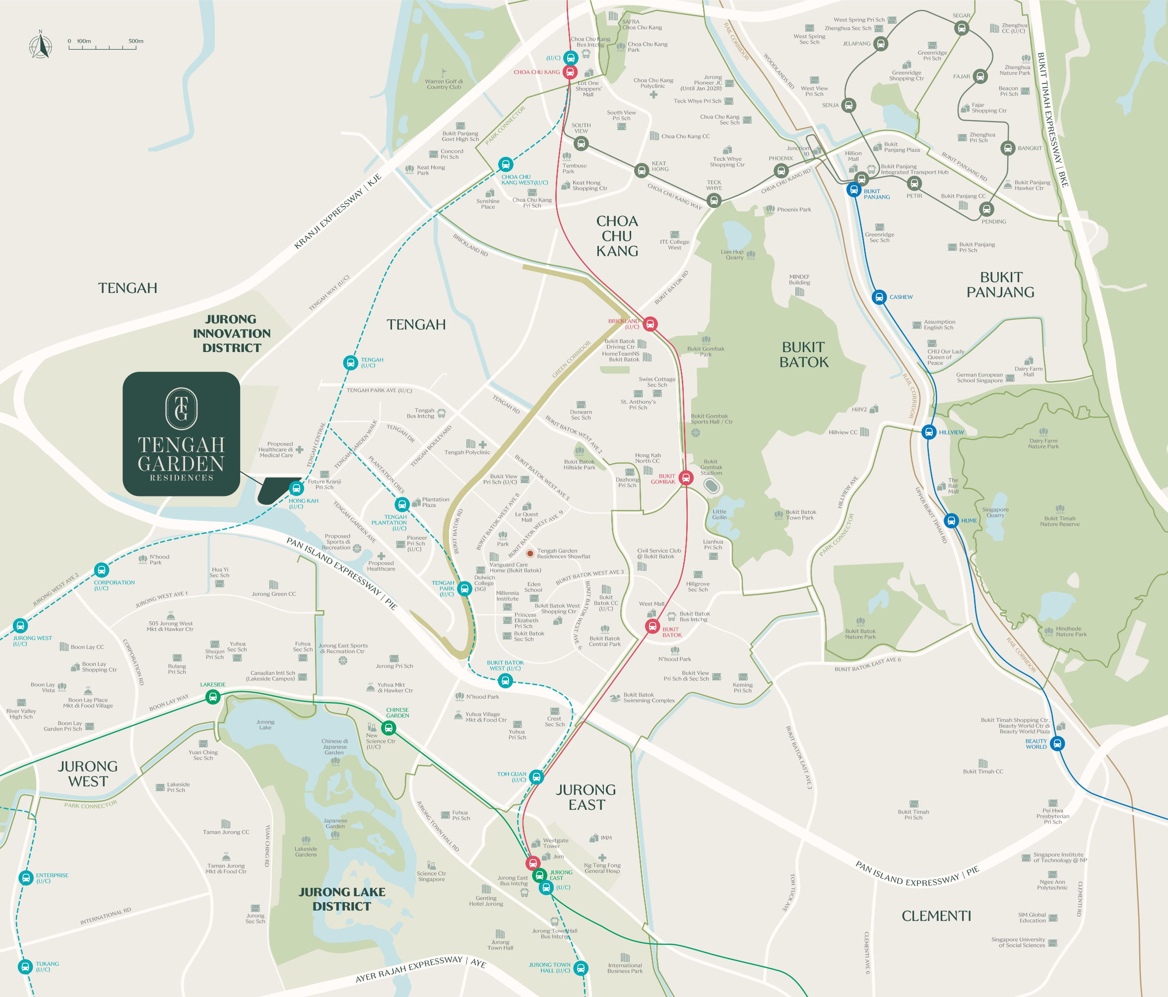 A headline advantage is connectivity: Tengah Garden Residences is marketed as being right beside the upcoming Hong Kah MRT Station on the Jurong Region Line (JRL), which is expected to strengthen access through the western corridor and towards key hubs in Jurong. For drivers, accessibility is supported via established expressways such as the PIE and KJE, offering flexible island wide travel options. This “rail + road” combination is often what makes day-to-day routines smoother—school runs, commuting, and weekend plans don’t feel constrained to one mode of transport.